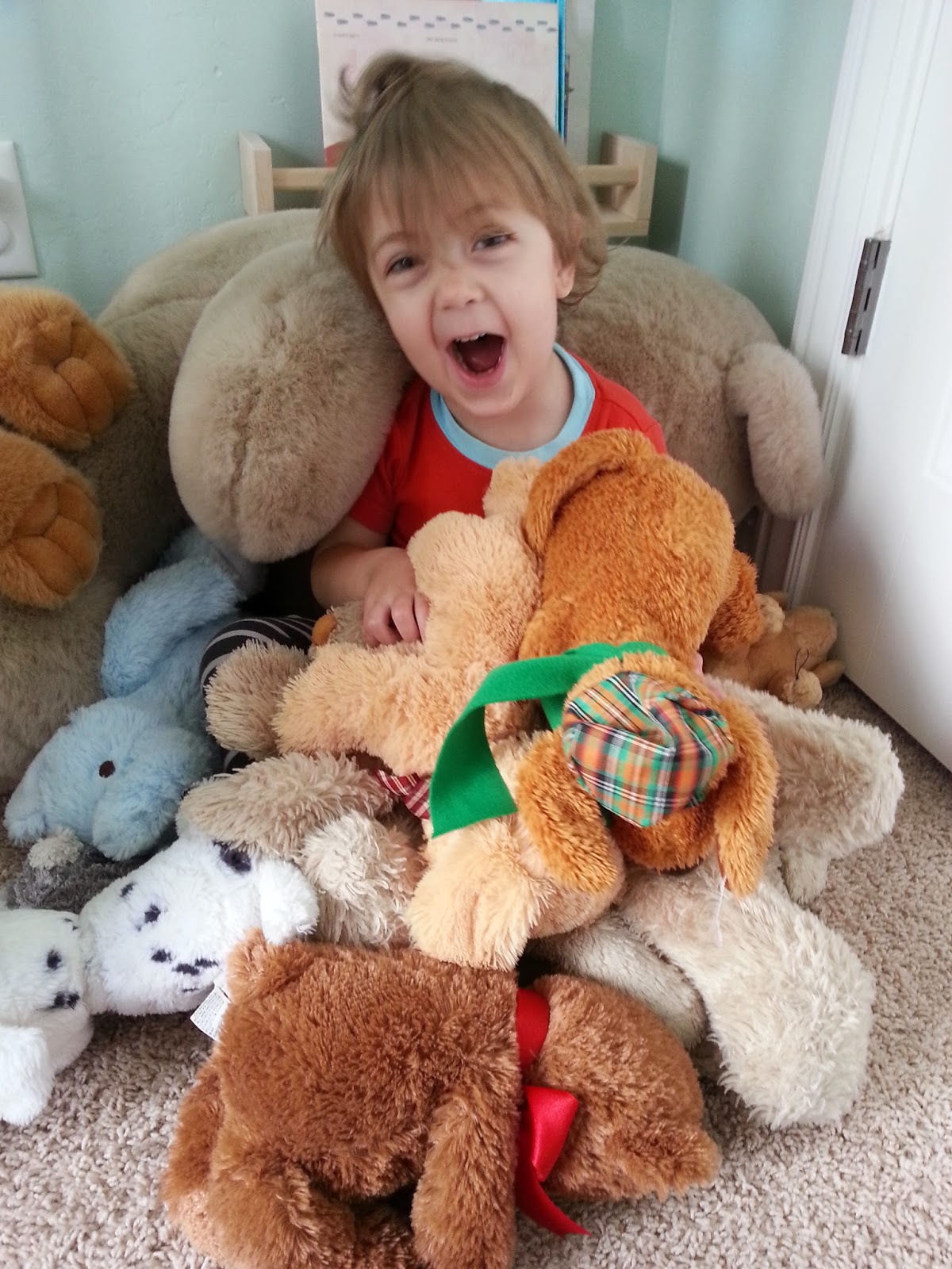 | This kid sleeps with so many puppies now. Pretty soon we won't be able to find him in the crib. |